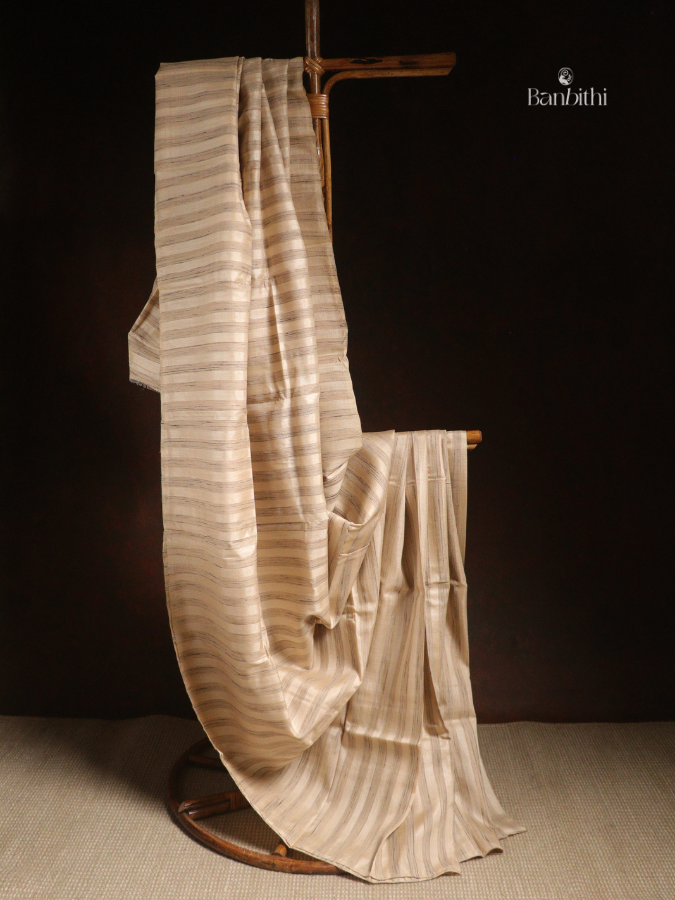 This Bhumija saree is made from a blend of tussar and kosa silk, hand spun and hand woven using traditional looms in the Murshidabad silk cluster. Crafted from virgin silk without dye, it highlights the natural tone and raw elegance of pure silk fibres.
