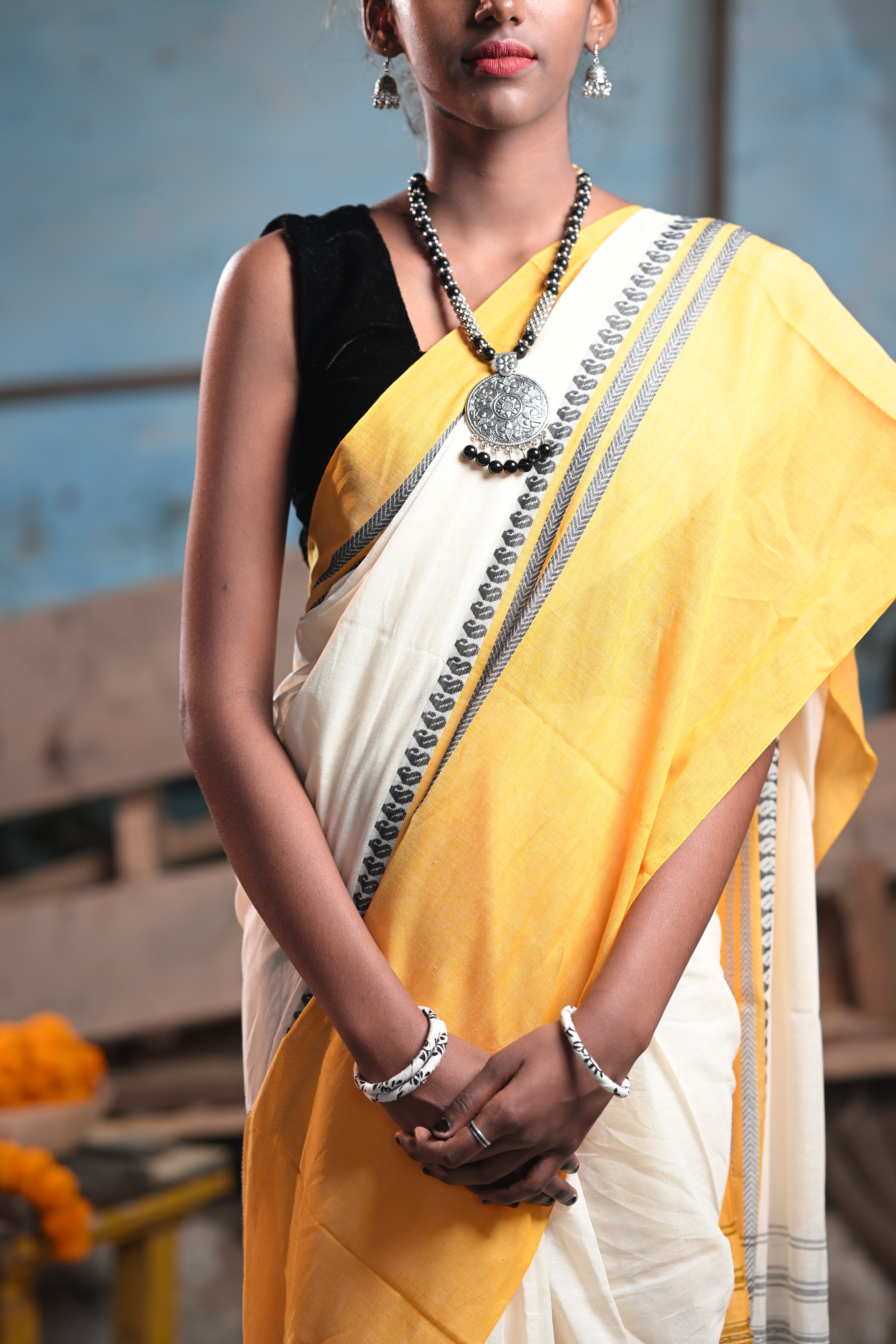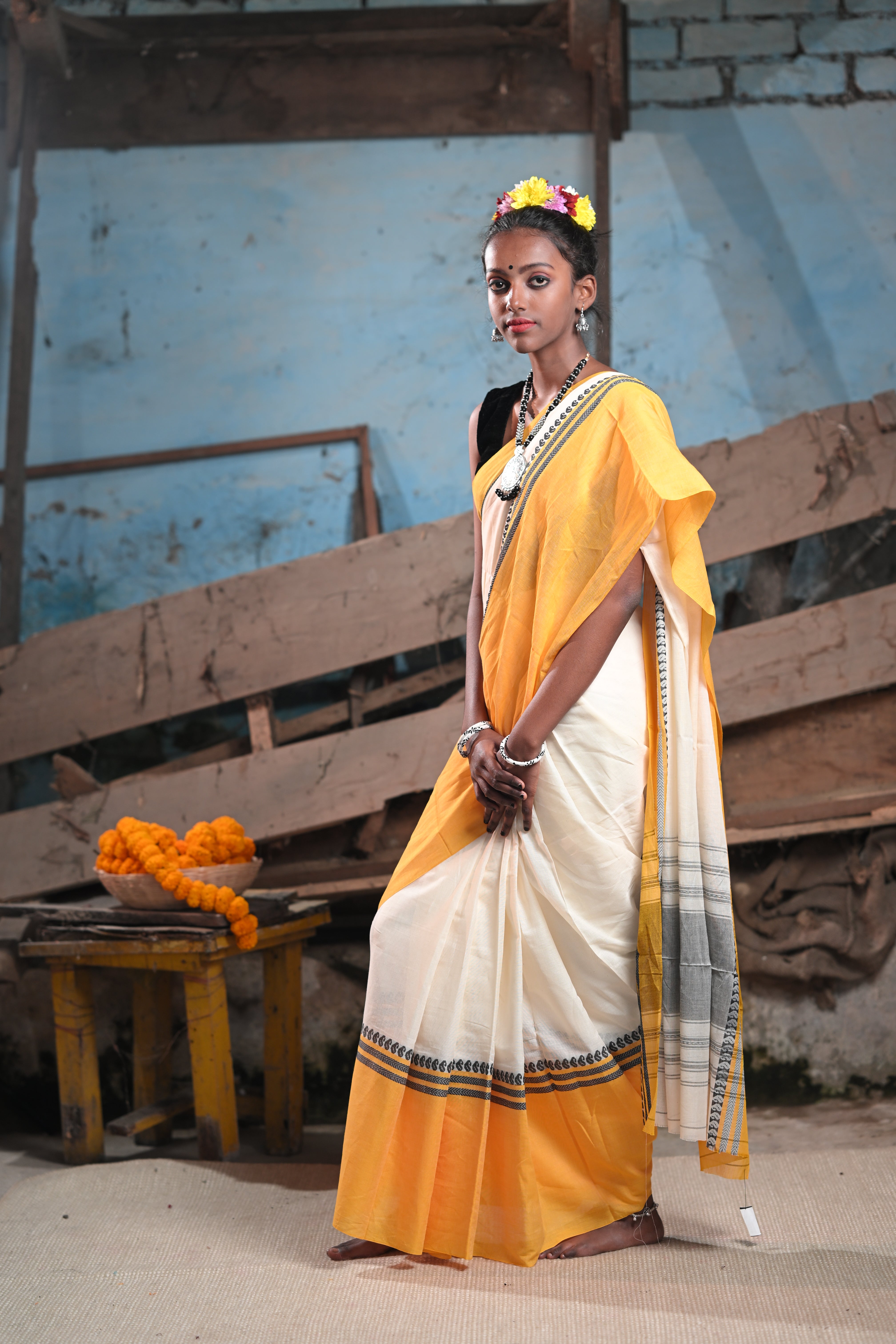 Cream Color Dhaniakhali Saree - Pure Cotton Handwoven Cloth