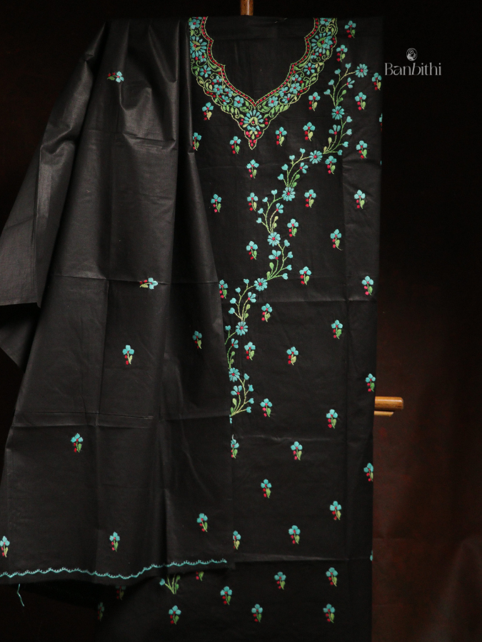 Hand Embroidered Cotton 3-Piece Suit Set – Black with Light Blue