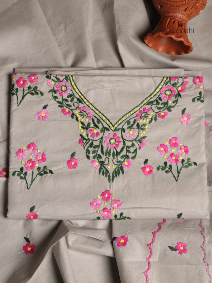 Hand Embroidered Cotton 3-Piece Suit Set – Beige Pink