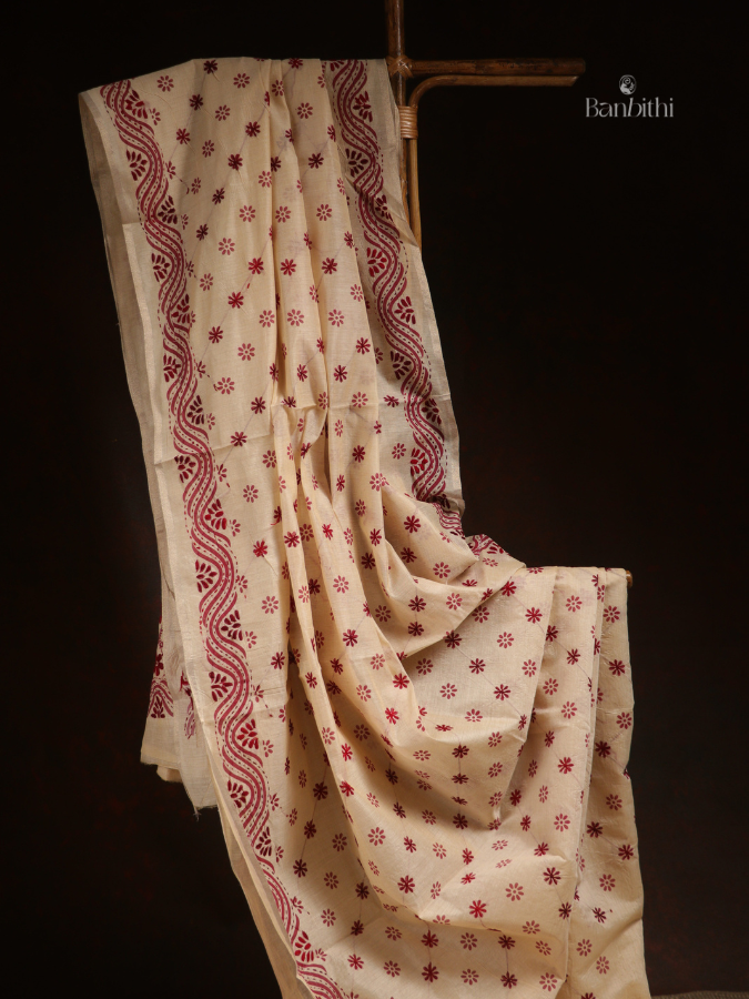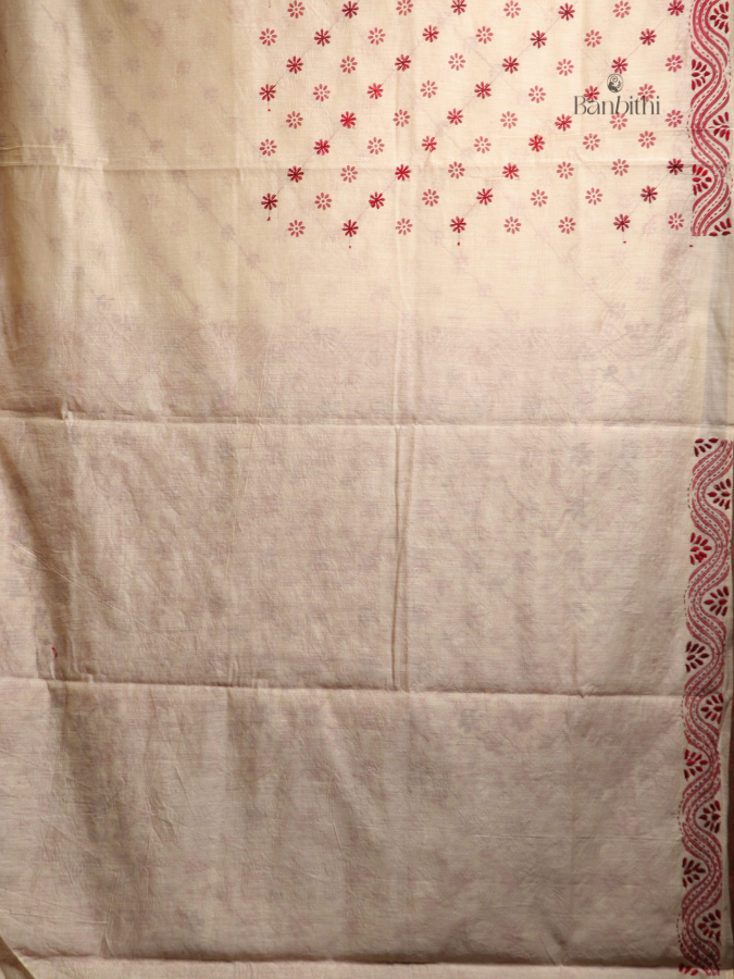 Hand Embroidered Saree – Off White with Red Thread