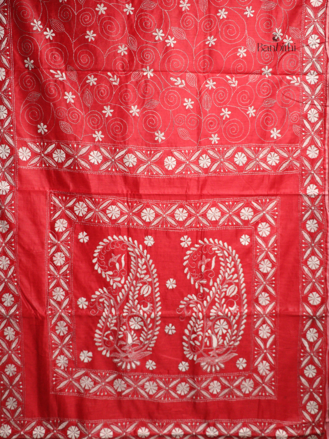Hand Embroidered Sico Chanderi Saree – Red with White Thread