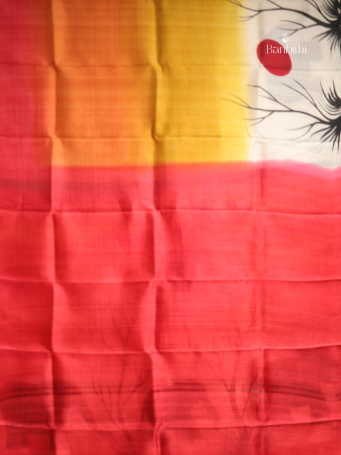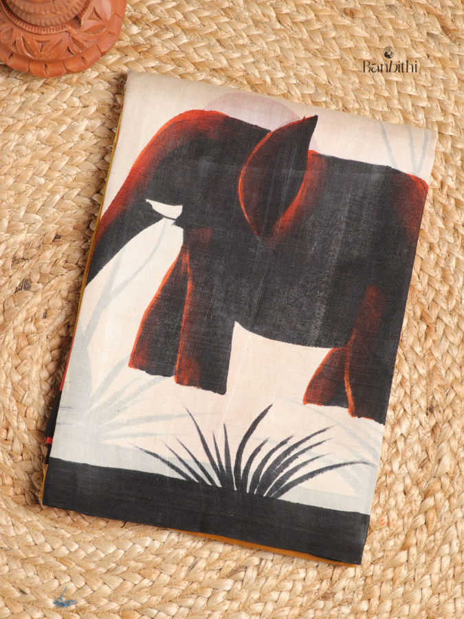 This hand painted saree is made from Murshidabad mulberry silk, known for its historical significance and natural sheen. The silk is hand spun and hand woven from Bombyx mori silkworm yarns, preserving its heritage character. Each saree is individually hand painted, giving it an artistic finish that blends traditional silk weaving with expressive surface design.