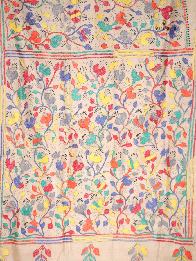 Hand kantha embroidered floral pattern on gachi tussar made in handloom with the help of hand spun silk yarn.