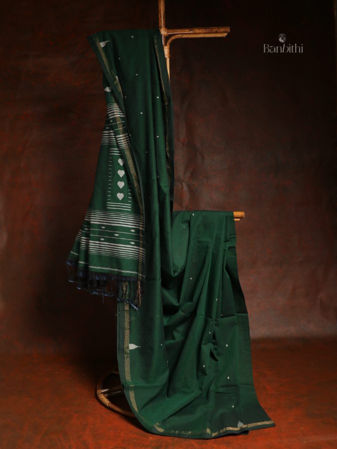 This hand-spun cotton Jamdani saree is crafted using the traditional extra-weft technique, where motifs are woven using needles to create the signature “floating” effect. Both sides of the saree mirror each other perfectly, a defining feature of authentic Jamdani weaving. Lightweight, breathable, and elegant - perfect for cultural events or everyday grace.