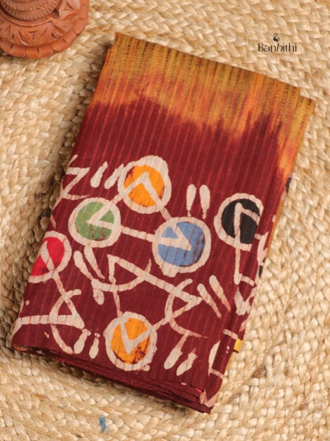 This digitally printed saree is woven on a handloom using a blend of Matka silk and pure silk from the Murshidabad silk cluster. The yarn is hand spun and hand woven, preserving its organic texture, while digital printing adds a contemporary layer of design to this traditional silk base.