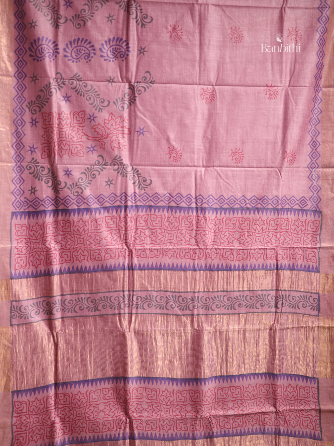 This saree is woven from a blend of Tussar and Matka silk and decorated with traditional hand block printing. Soft, breathable, and skin-friendly, the fabric offers comfort along with visual richness. The hand-applied motifs give each saree an artisanal finish rooted in craftsmanship.