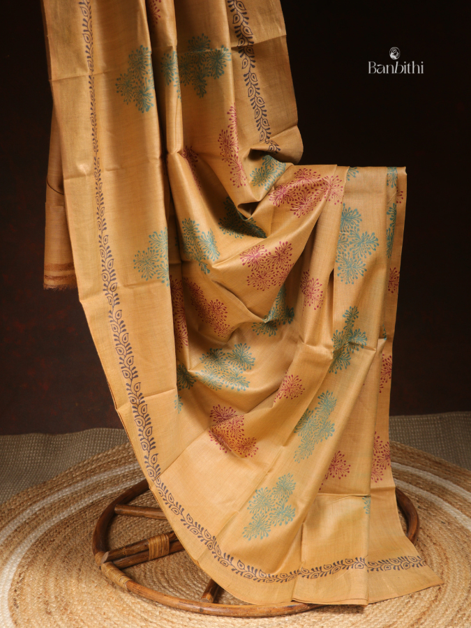 This saree is made from a blend of Tussar and Matka silk and finished with hand block printing. The fabric is soft, breathable, and skin-friendly, offering a graceful drape and natural texture. Handcrafted motifs enhance its elegance while maintaining artisanal authenticity.